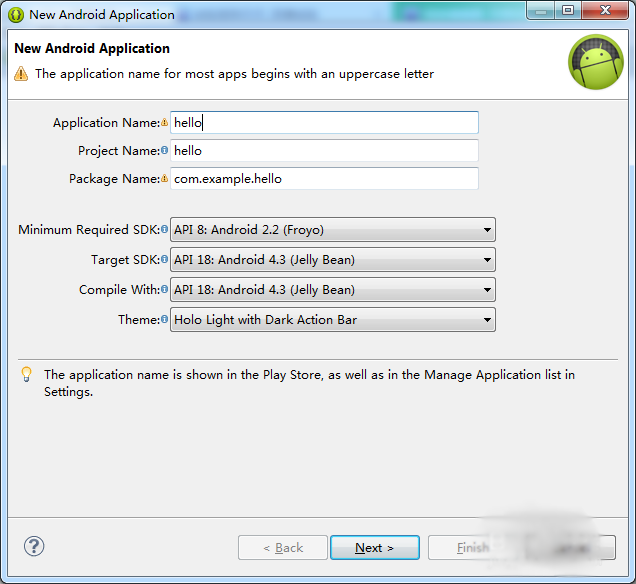 4、在打开的创建Android项目对话框中,我们需要输入应用程序的名字,项目名,和包名,不过一般情况下,我们只需要输入应用程序的名字,其余两个名字默认就ok了;比如在这里我输入【hello】;