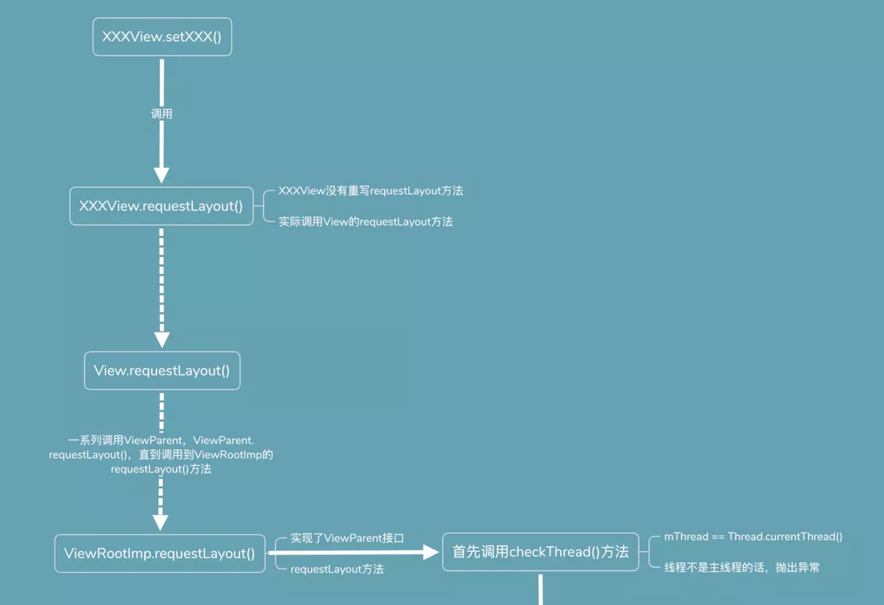 1.Android更新UI会调用View的requestLayout()方法,在requestLayout方法中,获取ViewParent,然后调用ViewParent的requestLayout()方法,一直调用下去,直到调用到ViewRootImp的requestLayout方法;