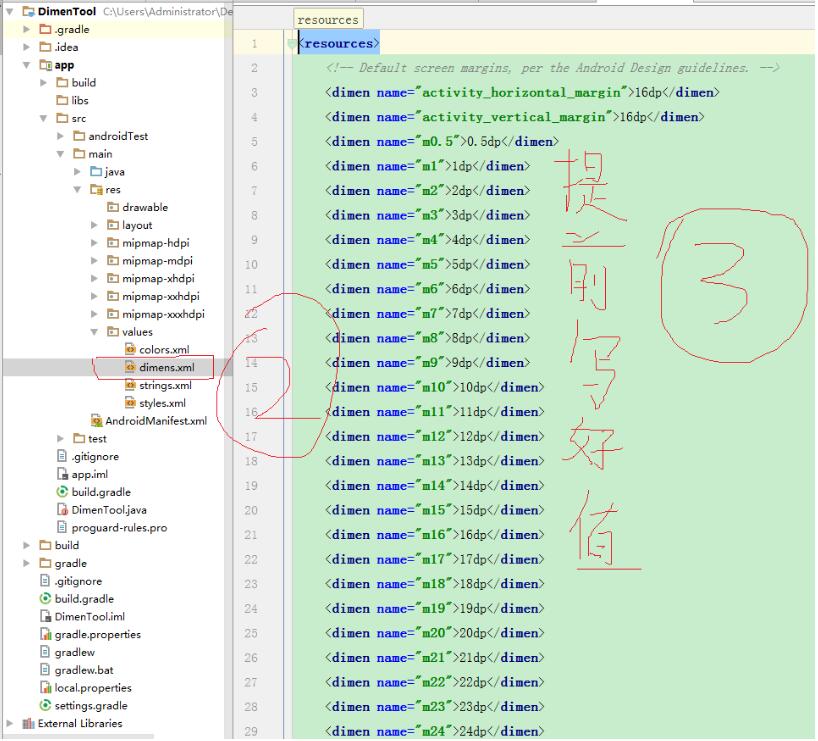 2.编写dimens下的数值(0.5-360,可根据项目来定范围,主要为以后方便使用),可直接把项目dimens复制到你的项目中