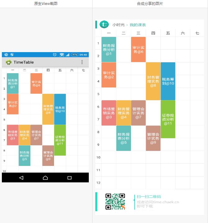 有时候分享功能都是很需要分享一个当前屏幕的界面的截图因,以前做校内APP的时候用到过,拿出来分享分享, 用以前写过的自定义课表软件。