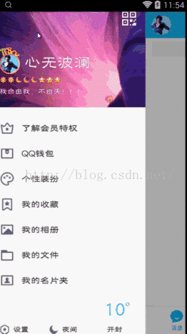其实要实现QQ 6.X版本侧滑效果最好的方案是使用HorizontalScrollView,因为左侧菜单的透视效果在DrawerLayout下无法实现,或者说实现起来很麻烦,所以在这里我们还是先介绍使用DrawerLayout来制作效果,毕竟是官方给的控件,优化方面不需要我们自己操心了。