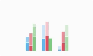 前面的两篇文章【动画效果(八) 、动画效果(九) 】中,我们只需要统计产品和地区,如果现在增加一个统计项目——销售渠道,那么使用之前的堆叠条形图和分组条形图都不适合。我们可以将两者结合,使用分组+堆叠条形图,实际效果如下图所示: