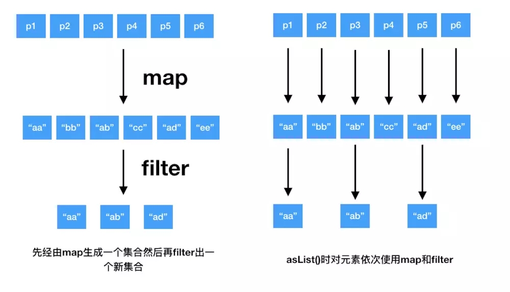 我们要知道filter和map都会返回一个列表来保存结果,如果peoples这个集合元素非常多的话,那产生的这个中间集合就非常大,并且这个链式调用会非常低效。