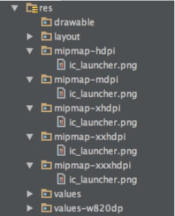 对于刚刚从Eclipse转向Android Studio的开发者们可能会对mipmap文件夹感到陌生,其实不用担心,我们平时的编程习惯并不需要发生任何改变,因为mipmap文件夹只是用来放置应用程序的icon的,仅此而已。那么在此之前,我们都是把应用程序的icon图标和普通的图片资源一起放到drawable文件夹下的,这样看上去就会比较杂乱,有的时候想从一堆的图片资源里面找icon半天也找不到,而文件一多也就容易出现漏放的情况,但恰恰Android是极度建议我们在每一种分辨率的文件夹下面都放一个相应尺寸的icon的,因此将它们独立出来专门放到mimap文件夹当中就很好地解决了这个问题。