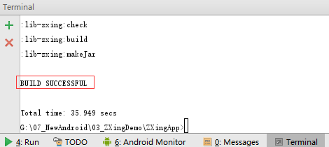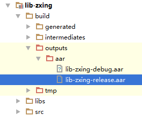 B 在 dependencies中加入 compile(name:lib-zxing-release', ext:'aar')