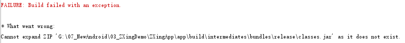 对于以上配置 form 默认 jar 包部分,在用目录是 from('build/intermediates/bundles/release/') ,注意粗体部分,最初我也是按照这个目录写的,确实没问题。但后来,也就是Android Studio 更新到2.3以后,发现这个目录没有了,取而代之的是 default 和 debug 目录,debug目录之前也是有的,没有变化,只是原来的release目录被现在的default目录代替了。这导致我后来生成jar包的时候始终没有找到jar包,报上图所示错误。