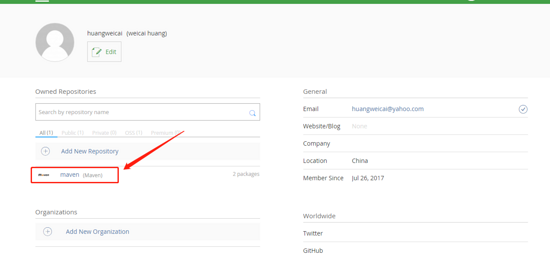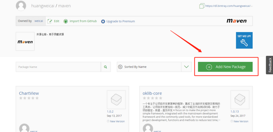 假设你已经注册账你并按照上面步骤操作,或者使用我提供的账号,登陆成功后会出现如下界面,点击maven进入该仓库,并点击Add New Package创建新的包。