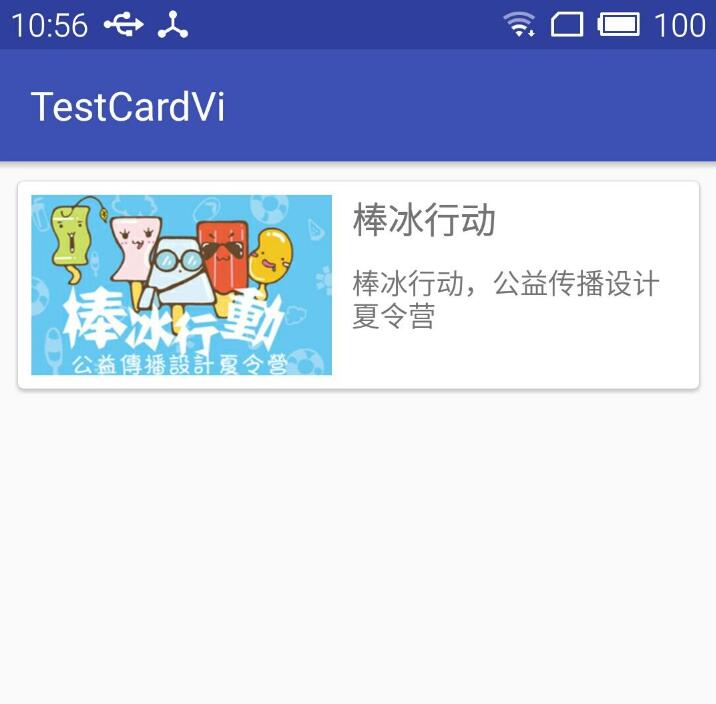 <?xml version="1.0" encoding="utf-8"?> <LinearLayout xmlns:android="http://schemas.android.com/apk/res/android" android:layout_width="match_parent" android:layout_height="match_parent"> <android.support.v7.widget.CardView android:id="@+id/cardView" android:layout_width="match_parent" android:layout_height="wrap_content" android:layout_margin="10dp"> <LinearLayout android:layout_width="match_parent" android:layout_height="100dp"> <ImageView android:layout_width="150dp" android:layout_height="match_parent" android:layout_margin="5dp" android:scaleType="centerCrop" android:src="@drawable/sng" /> <LinearLayout android:layout_width="match_parent" android:layout_height="match_parent" android:orientation="vertical"> <TextView android:layout_width="match_parent" android:layout_height="wrap_content" android:padding="5dp" android:text="棒冰行动" android:textSize="18sp" android:textStyle="bold" /> <TextView android:layout_width="match_parent" android:layout_height="wrap_content" android:padding="5dp" android:text="棒冰行动,公益传播设计夏令营" /> </LinearLayout> </LinearLayout> </android.support.v7.widget.CardView> </LinearLayout>
