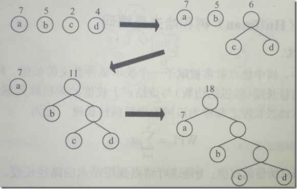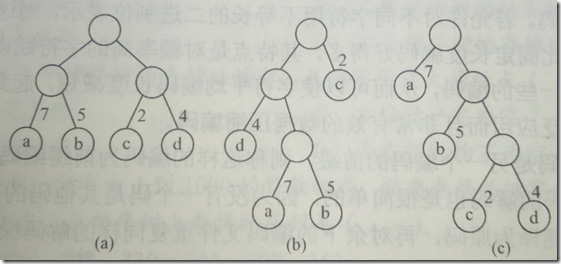如下图所示,有三课二叉树,每个树都有四个叶子节点a,b,c,d,分别取带权7,5,2,4。他们的带权路径长度分别为