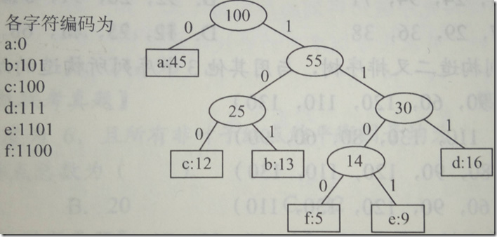 我们对一个字符串进行统计发现a-f出现的频率分别为a:45,b:13,c:12,d:16,e:9,f:5,我们对该字符串进行采用哈夫曼编码进行存储。