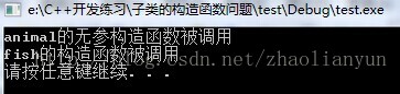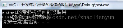 在子类fish的构造函数中,加上一个冒号(:),然后加上父类的带参构造函数,这就是父类构造函数的显式调用。这样,在子类的构造函数被调用时,系统就会去调用父类的带参构造函数,从而实现初始化父类的成员变量。运行结果如下: