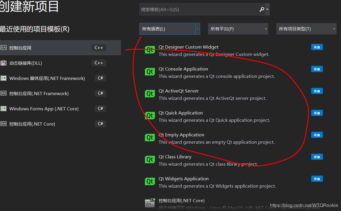 之后重启vs2019就可以了在新建项目中看到Qt了。如图