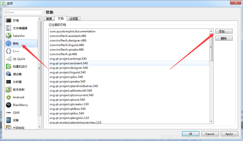 QCustomPlot源码包中,有QCustomPlot帮助文件,将其添加进Qt帮助文件,如图,点击添加按钮,在下载的QCustomPlot源码包中找到qch为后缀的文件进行添加。