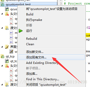 2.QtCreater中,右键项目,添加现有文件,如图,选择qcustomplot.h和qcustomplot.cpp添加: