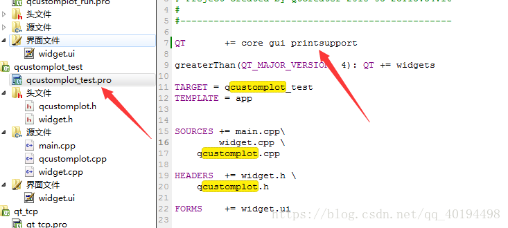 5.选择项目的.pro文件,添加printsupport,如图,QCustomPlot包含了一些打印的东西,如果没有这一步,程序会报错