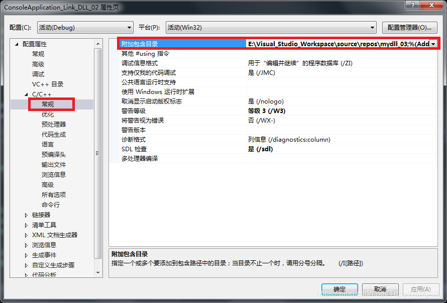 2.添加工程的头文件目录:工程---属性---配置属性---c/c++---常规---附加包含目录:加上头文件存放目录。