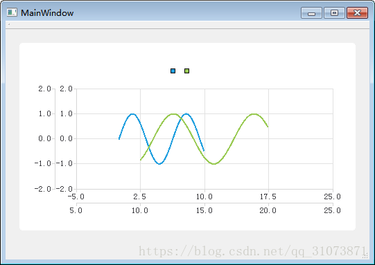 根据上面程序最后两行的注释,我们如果把这两个QLineSeries数据系列,绑定到同一组XY轴上(也即,两条曲线共享同一组XY轴),两条曲线就能“真正”的显示在同一个chart中了,如下所示。