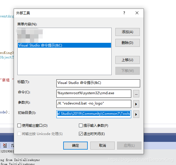 从VS2019菜单选择“Tools”,然后选择“外部工具”。输入如下: