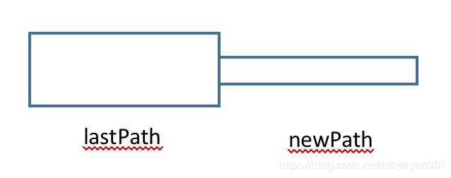 从上面的图示可以看到,我们将最新的newPath绘制细线,那么如果这时候又出现一个新的点,形成了新的path,而之前的newPath就会变成前一个path,这里命名为lastPath,由于该path还是细线,所以这里我们需要将前一个path重新补充绘制成正常的粗线,图示如下: