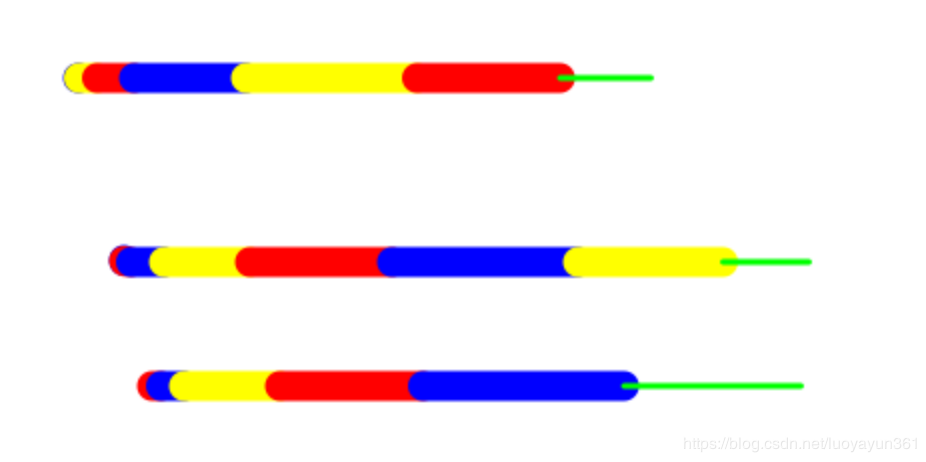 为了区分不同的path,这里采用了不同的颜色来代表,每一段颜色代表一个path,最新的path就是右边的绿色线条,可以看到最新的path和前一条path由于线宽不同, 所以连接处并不平滑,所以要解决这个问题,需要做最后一步:补点。
