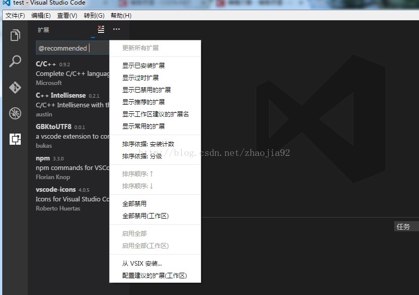 Visual Studio Code编辑器在Windows上安装比较简单,直接setup.exe。安装好后首次启动配置插件,插件配置必须联网,从网上下载。如下图点击左侧扩展: