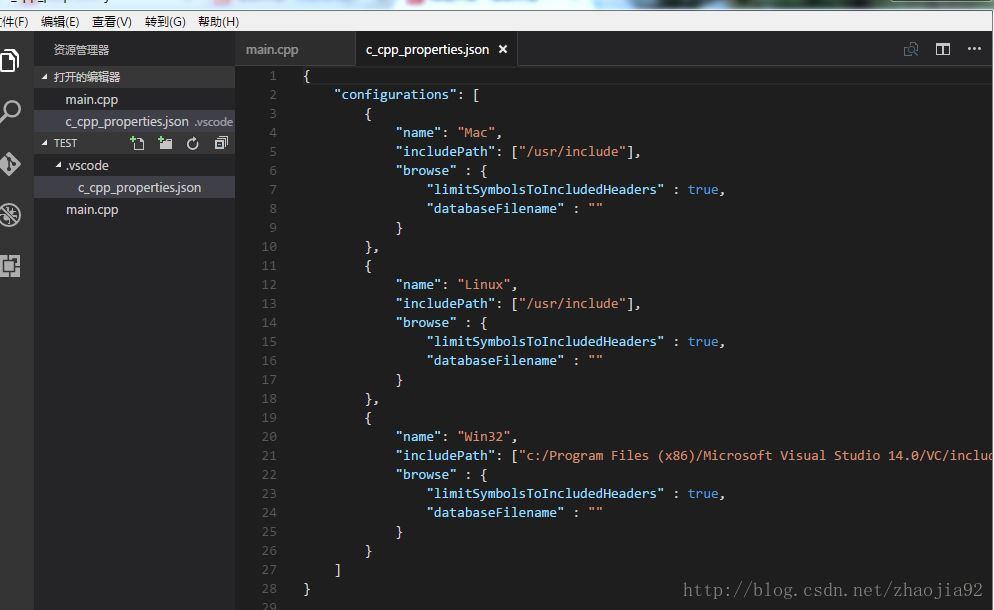 发现#include <iostream>提示找不到路径,因为没有配置库目录。此时按下Ctrl+. ,出现Add Include path to setting按钮,点击后编辑器自动新建配置文件,如下: