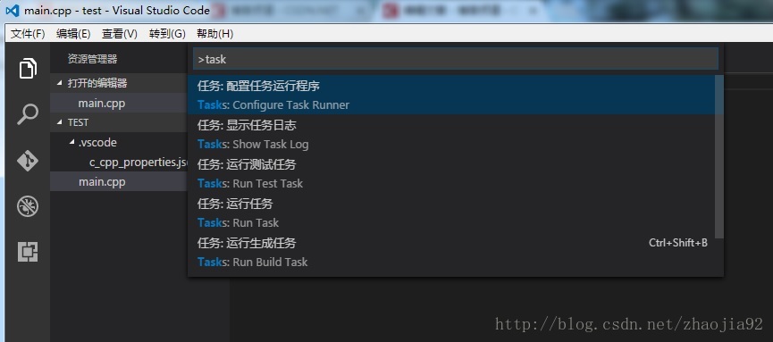 对写好的main.cpp进行编译,需要新建编译任务。按Ctrl+p唤出编辑器命令行,输入>task,选择配置任务运行程序->others