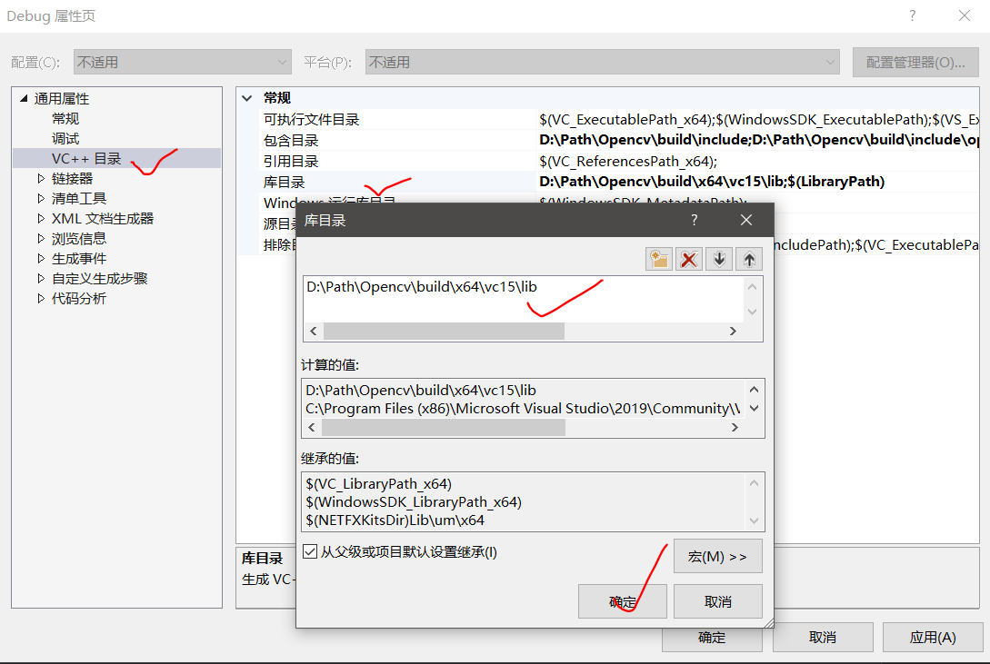 9、VC++目录->常规->库目录中加入D:PathOpencvbuildx64vc15lib(以自己的安装目录为主)