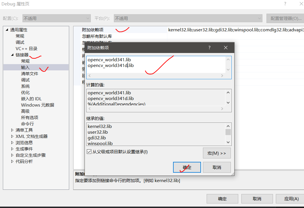 10、链接器->输入->附加依赖项中加入opencv_world341d.lib,opencv_world341.lib,确认。