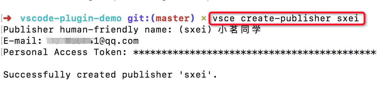 获得个人访问令牌后,使用vsce以下命令创建新的发布者: