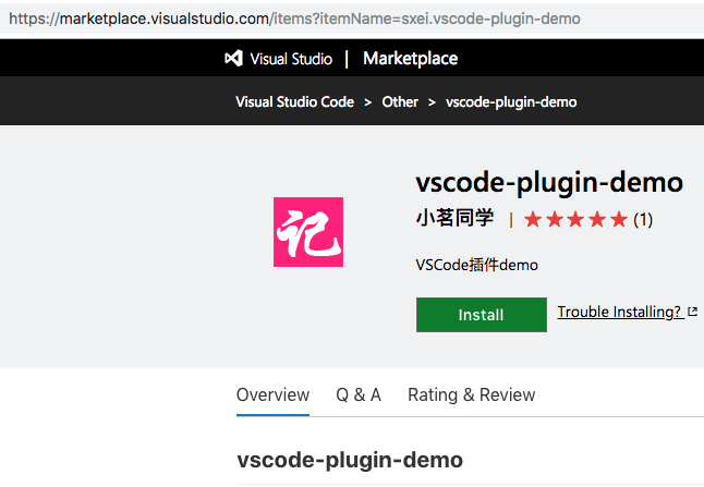 发布成功后大概需要过几分钟才能在应用市场搜到。过几分钟就可以访问网页版的插件主页:https://marketplace.visualstudio.com/items?itemName=sxei.vscode-plugin-demo