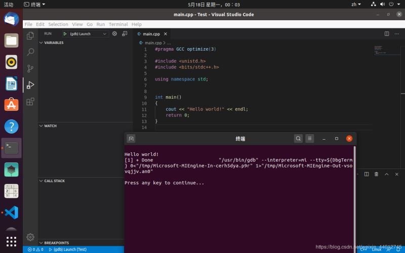 按下F5,输出“Hello world”将在终端中显示,至此完成配置工作!