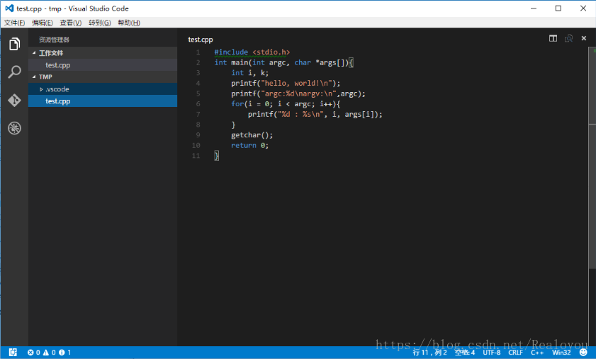 打开文件夹后,新建test.cpp进行输入代码测试: