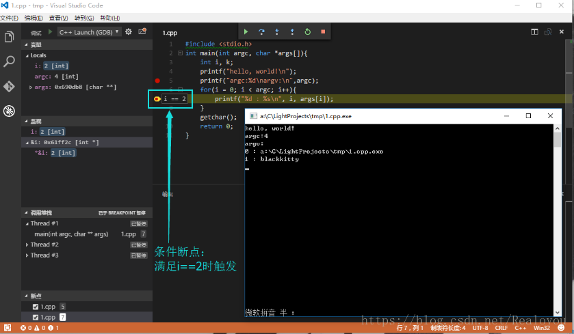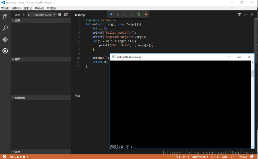 保存一下,然后切换至test.cpp,再次按F5启动调试~