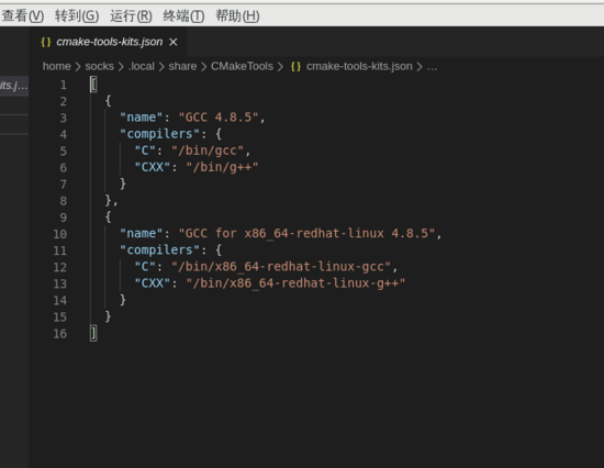 选者需要的编译环境,我这里选者的三GCC 4.85这项,如果没有列出有关GCC编译器的相关选项,则选择Scan a Kit for test(项目名)这一项 如果搜索之后找不到任何一个kit,则在命令窗口中输入cmake : edit User-local CMake Kits,然后根据你所安装的gcc的环境配置,按照图中的格式配置cmake-tools-kets.json。
