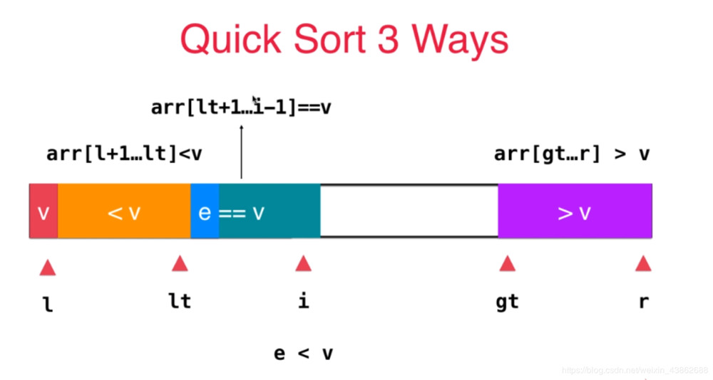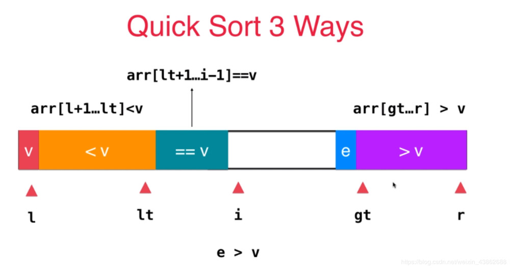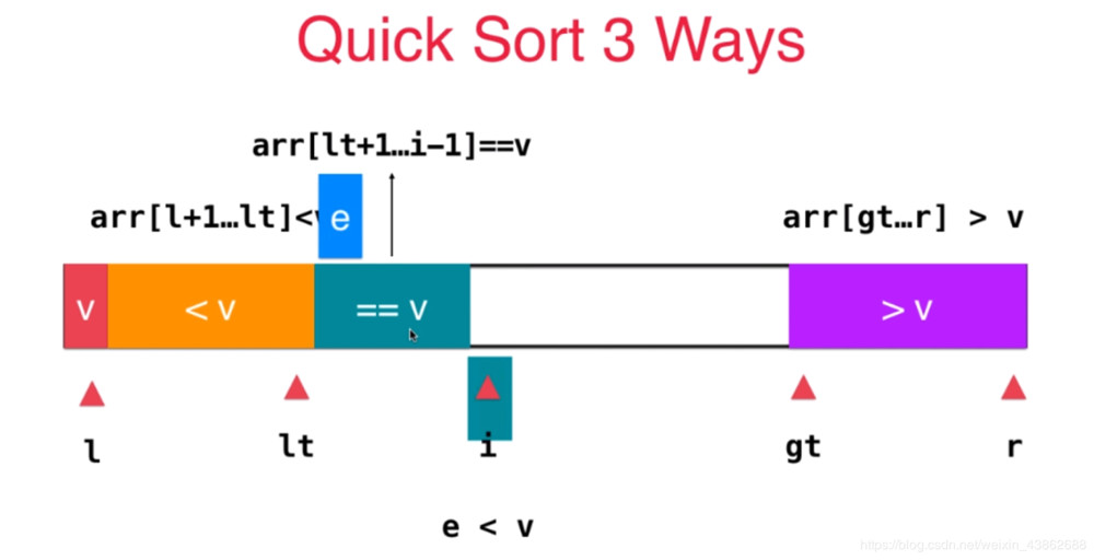1、采用随机排序的方法将某个数作为分割数,放在数组开头,该数定义为v。将小于v的一段数组开头的数索引定义为lt,将需要遍历的数组的索引定义为i,将小于v的一段数组的索引定义为gt,数组的开头和结尾的索引分别为l和r。原理图如下: