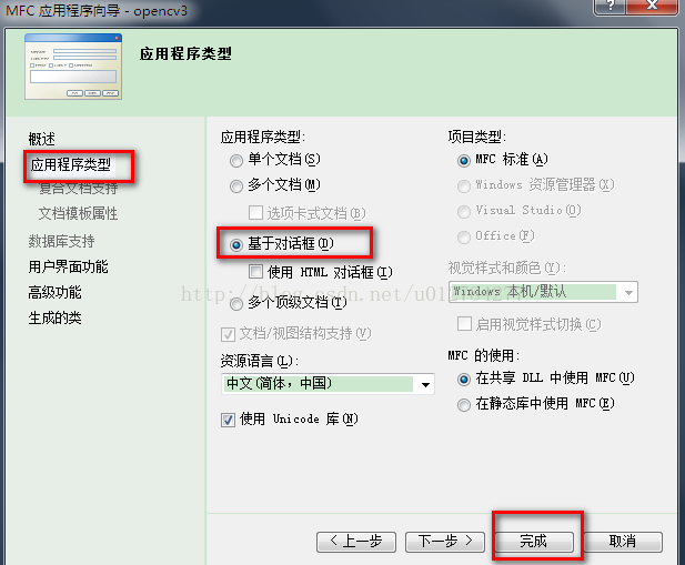 其余选项默认,单击完成,创建出对话框应用程序。删掉原来自带的一些控件,添加picture控件和两个按钮。
