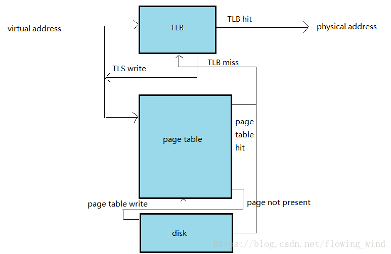 MMU映射单位并不是字节,而是页,这个映射通过差一个常驻内存的数据结构页表来实现。现在计算机具体的内存地址映射比较复杂,为了加快速度会引入一系列缓存和优化,例如TLB等机制,下面给出一个经过简化的内存地址翻译示意图: