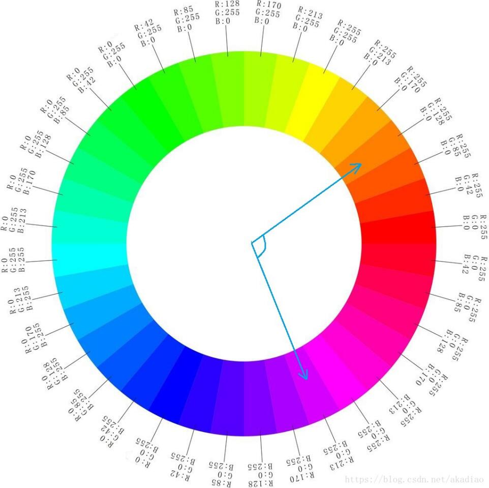 有朋友问颜色范围的事,比如我们选择某个偏红色的范围,如色环图中这个区间即BGR(0,128,255)到BGR(255,0,213);则B、G、R这三个通道的范围分别为0-255,0-128,213-255。因此阈值下限lowerb=Scalar(0,0,213),阈值上限upperb=Scalar(255,128,255)。