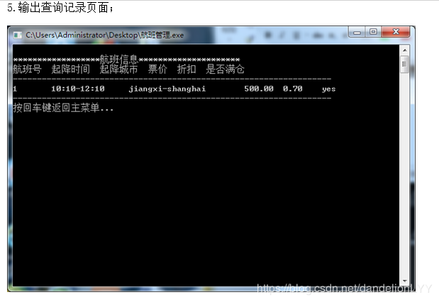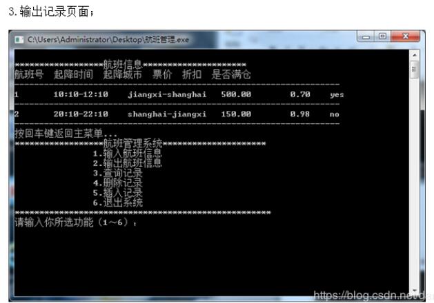 1)输入记录:输入录入航班信息,包括:航班号,起降时间,起飞抵达城市,航班票价,票价折扣,航班是否满仓等;