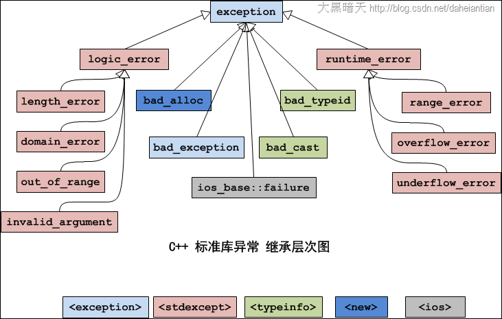 和java一样,标准库中也提供了很多的异常类,它们是通过类继承组织起来的。标准异常被组织成八个。