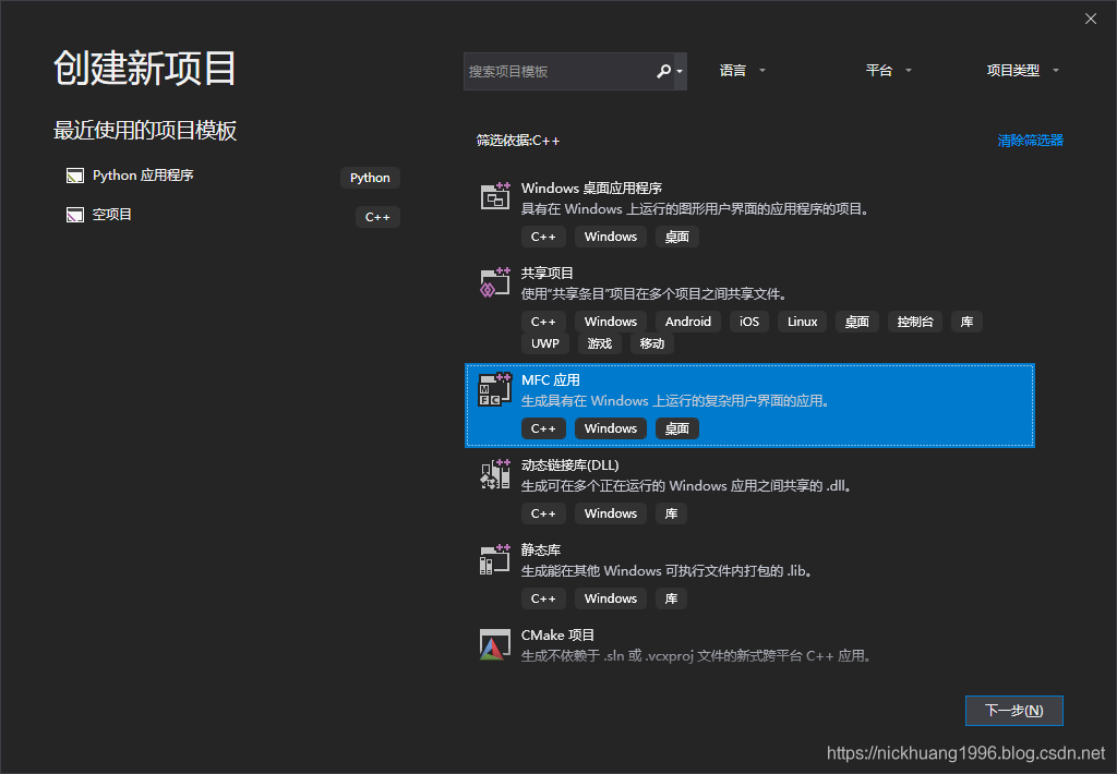 7.我们创建新项目,可以看到已经有MFC应用这个选项