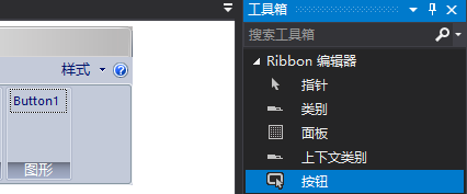 3.我们再选择Ribbon工具箱里的按钮,同样拖动,至图形面板,如下,名字为button1