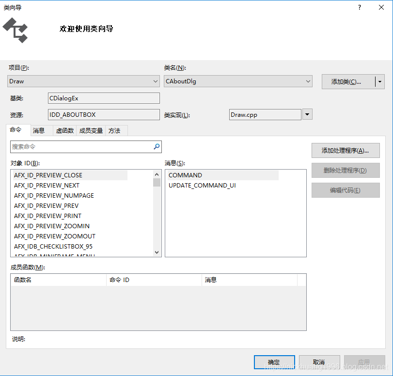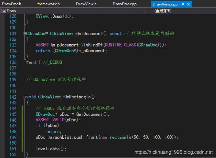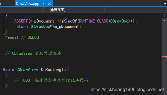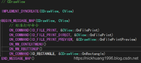 我们也可以看到在前面的代码中多了一个ON_COMMAND函数,说明我们确实添加了这样的一个按钮命令(注意:ID_RECTANGLE这个ID号就是对应的按钮的编号,&CDrawView::OnRectangle表示这个ID的按钮实现的命令函数)