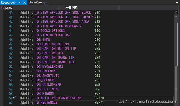 这里的红波浪线提示没有这个ID,其实我们是添加了这个按钮的,可以在Resource.h中看到(注意打开Resource.h再去看资源试图是打不开的,会报错,因此需要先关掉Resource.h再去访问资源试图!!!!!)