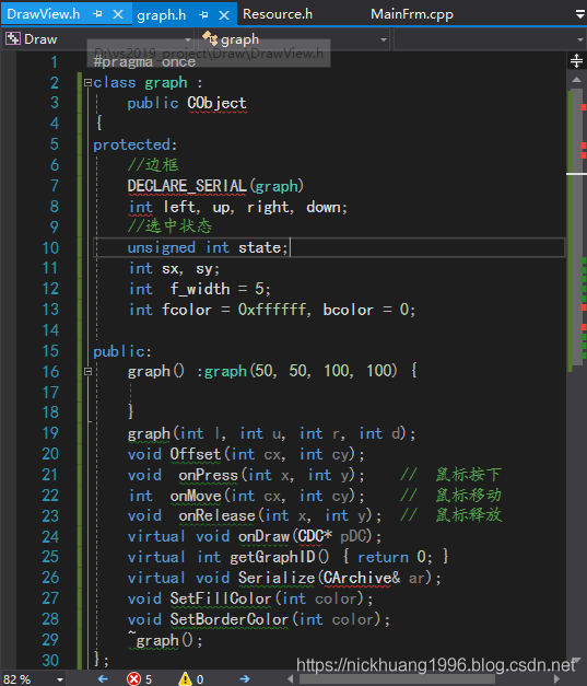 9.现在的问题就是如何画图的问题:画矩形,则定义一个矩形类,写方法,在消息函数里新建对象即可;但是我们如果不满足只画矩形呢?画箭头、三角可不可以?这个时候我们就应该想到继承,即建一个抽象类graph,然后派生几个子类去完成这个功能。因此我们应该先新建一个graph抽象类: