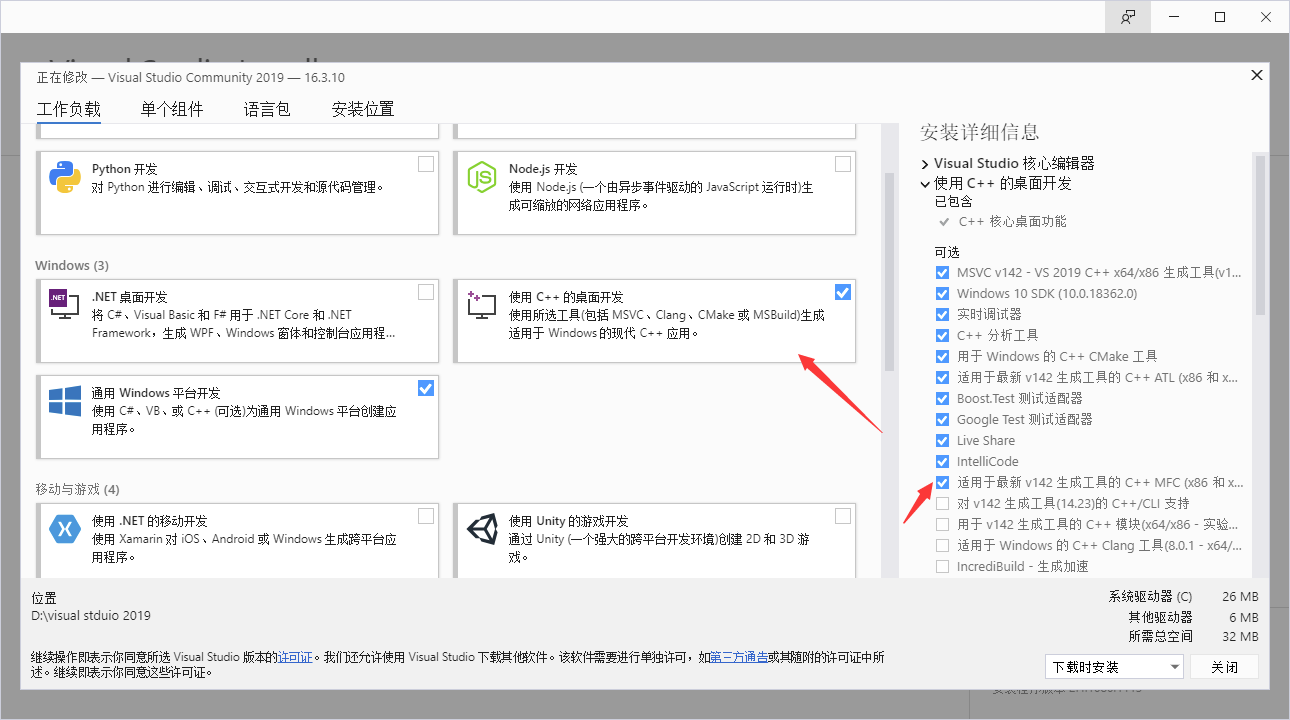 进入vs模块更新界面,在这里可以更新你的vs所装的模块,要想支持mfc开发,需要勾选c++桌面开发中的mfc模块,默认情况下是不勾选的.然后更新即可.不要选择单个组件安装,会出现各种棘手的问题.