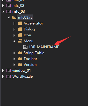 首先我们展开自动构架的mfc项目的资源文件,双击.rc文件打开资源视图,找到Menu目录下的IDR_前缀的文件,双击打开,进入窗口可视化设计视图: