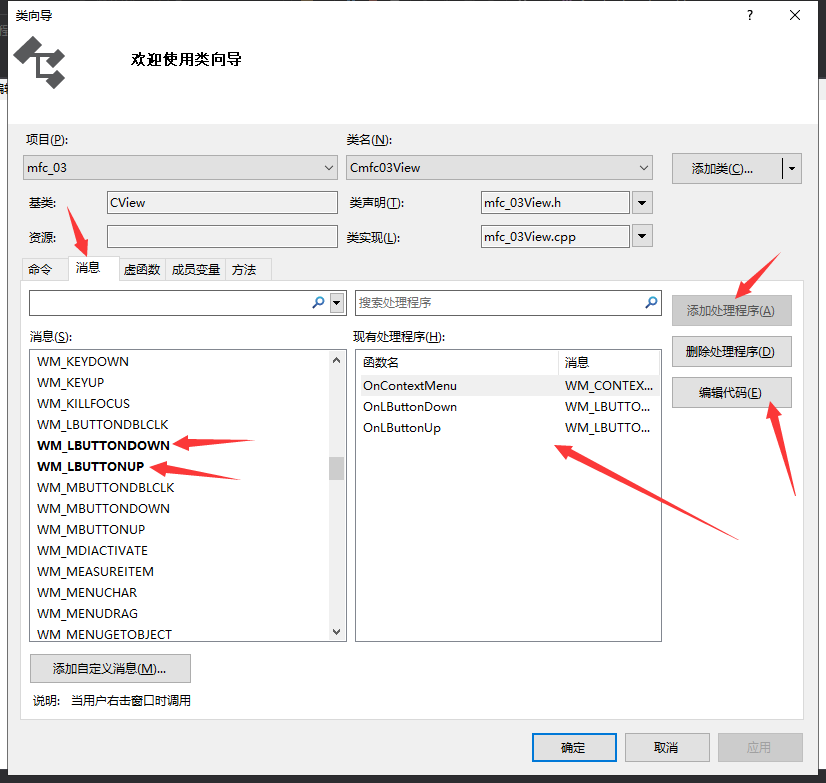 打开消息选项卡,可以找到wm_lbuttondown与wm_lbuttonup两个消息添加处理程序,然后点击编辑代码,即可进入自动生成的函数体中,编写实现代码了: