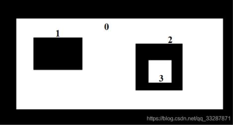 图为一个具有4个不连通边缘的二值化图像,由外到内依次为0号、1号、2号、3号条边缘。为了描述不同轮廓之间的结构关系,定义由外到内的轮廓级别越来越低,也就是高一层级的轮廓包围着较低层级的轮廓,被同一个轮廓包围的多个不互相包含的轮廓是同一层级轮廓。例如在图中,0号轮廓层级比1号和第2号轮廓的层及都要高,2号轮廓包围着3号轮廓,因此2号轮廓的层级要高于3号轮廓。